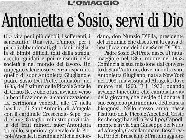 Per i dettagli, visita la pagina degli eventi dedicati a Suor Antonietta Giugliano, raggiungibile cliccando qui. Per scaricare il volume, visita la pagina degli scritti di Suor Antonietta Giugliano, cliccando sul link del menu a destra, oppure cliccando qui Il 23 gennaio 2010 si terrà il Pellegrinaggio alla tomba del Servo di Dio, Padre Sosio Del Prete, Fondatore delle Piccole Ancelle di Cristo Re.